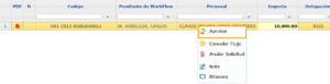 Aparece la opción para Aprobar y también opciones para Cancelar flujo ( esto regresa al solicitante al estado Abierto), Anular ( solicita un motivo) además de las opciones de Nota y Bitácora ( historial del registro):