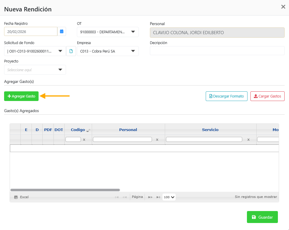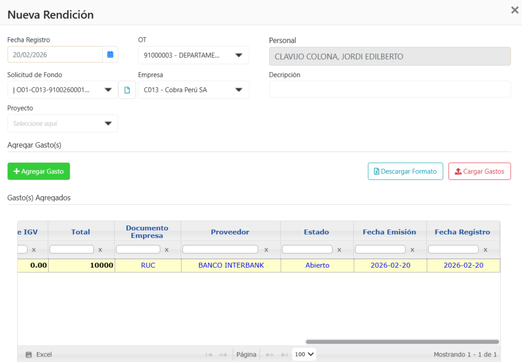Como se puede mostrar, ya se pudo agregar correctamente el gasto a la rendición: