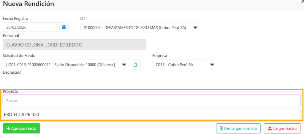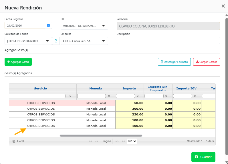 Los gastos por rendir se pueden ingresar uno a uno o también de forma masiva llenando el formato:
