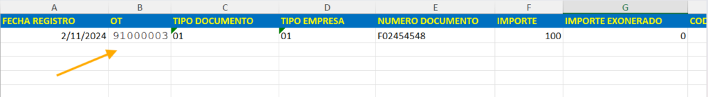 Donde ingresamos el código y el valor a ingresar en el formato Excel para su correcto registro.