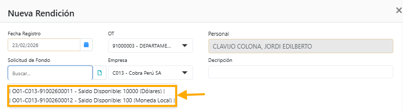 Si la OT seleccionada tiene un presupuesto activo, aparecerá también para su rendición: