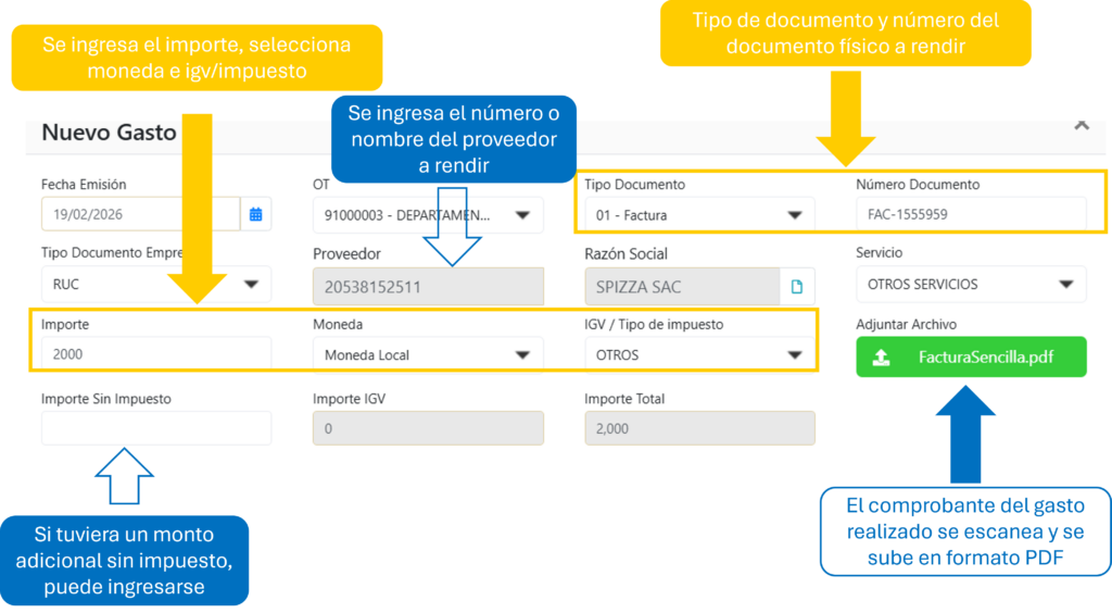 Se ingresa los datos del documento a rendir como una factura, se ingresa el número de identificación del proveedor o el nombre para la búsqueda, luego el tipo de servicio, el importe con el tipo de cambio (moneda) y si tiene impuesto. En caso de que el documento cuente con un importe adicional sin impuesto como por ejemplo «una propina» en una factura de restaurant puede ingresarlo. Se carga además el documento escaneado de la factura por rendir en formato PDF: