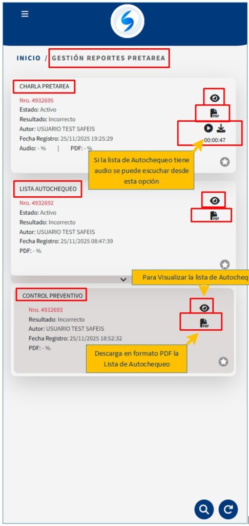 Desde esta sección podemos visualizar y tener la información respecto de los registros de la lista de Autochequeo, Charla PreTarea y el Control Preventivo que realizamos previamente: