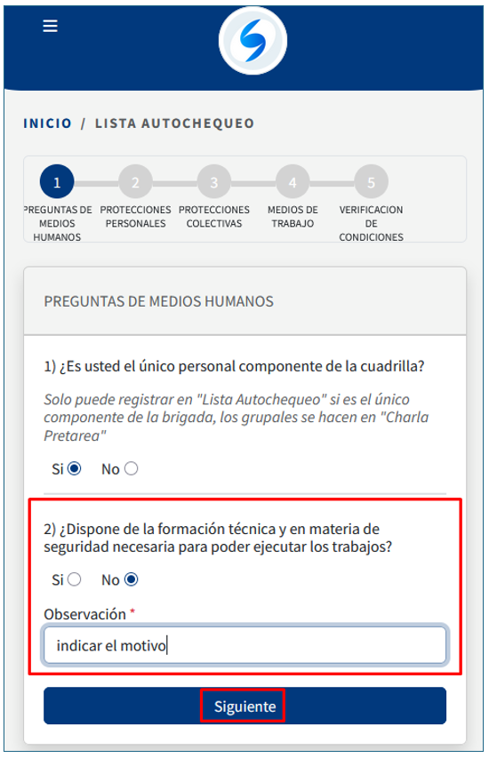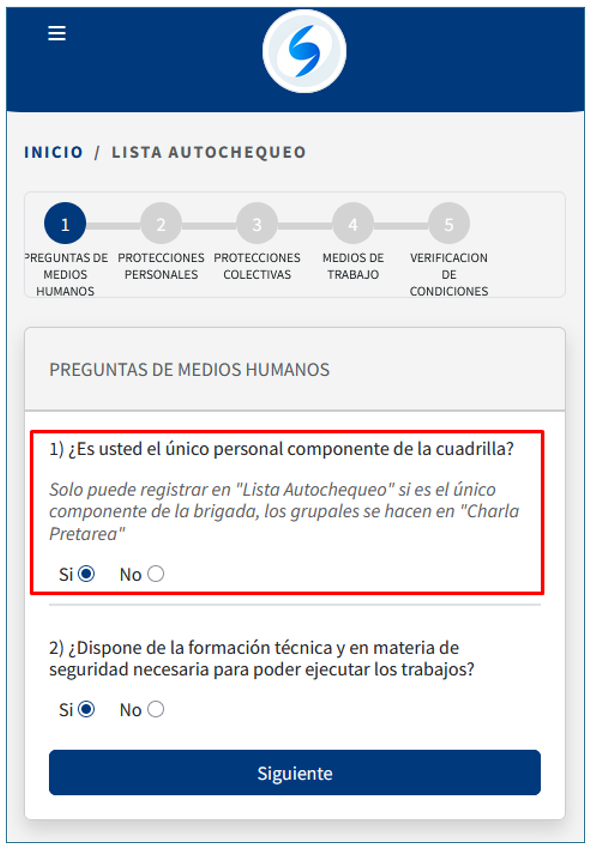 1)En primera instancia te pide confirmar si tiene un equipo de trabajo o no. Si se responde que es único personal, si tiene personal a cargo tener en cuenta que debe realizar la opción de CHARLA PRE-TAREA: