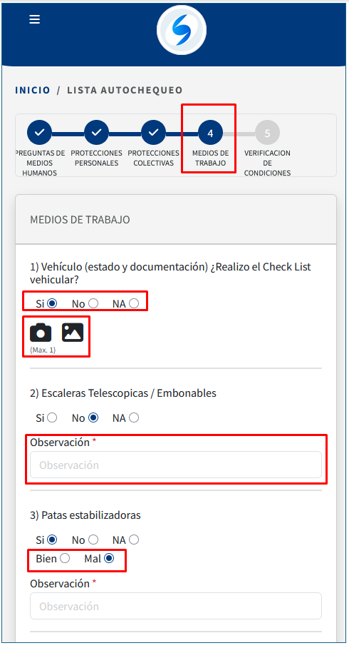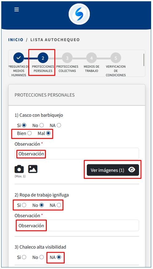 2)Lo siguiente es responder las preguntas de protección personal, si se responde que no tiene buen estado el sistema te pide una fotografía que puede ser tomada con el equipo móvil o se carga desde las imágenes de galería del equipo: