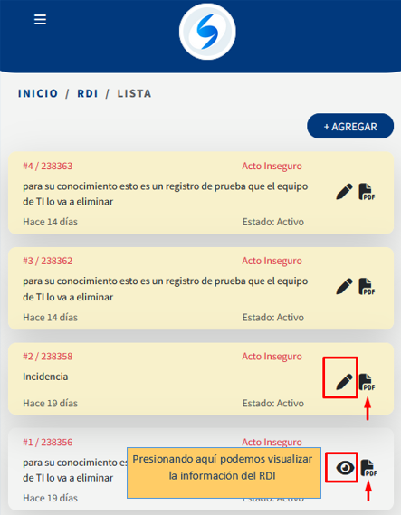 Luego de registrado el RDI aparece en la lista de tus registros: