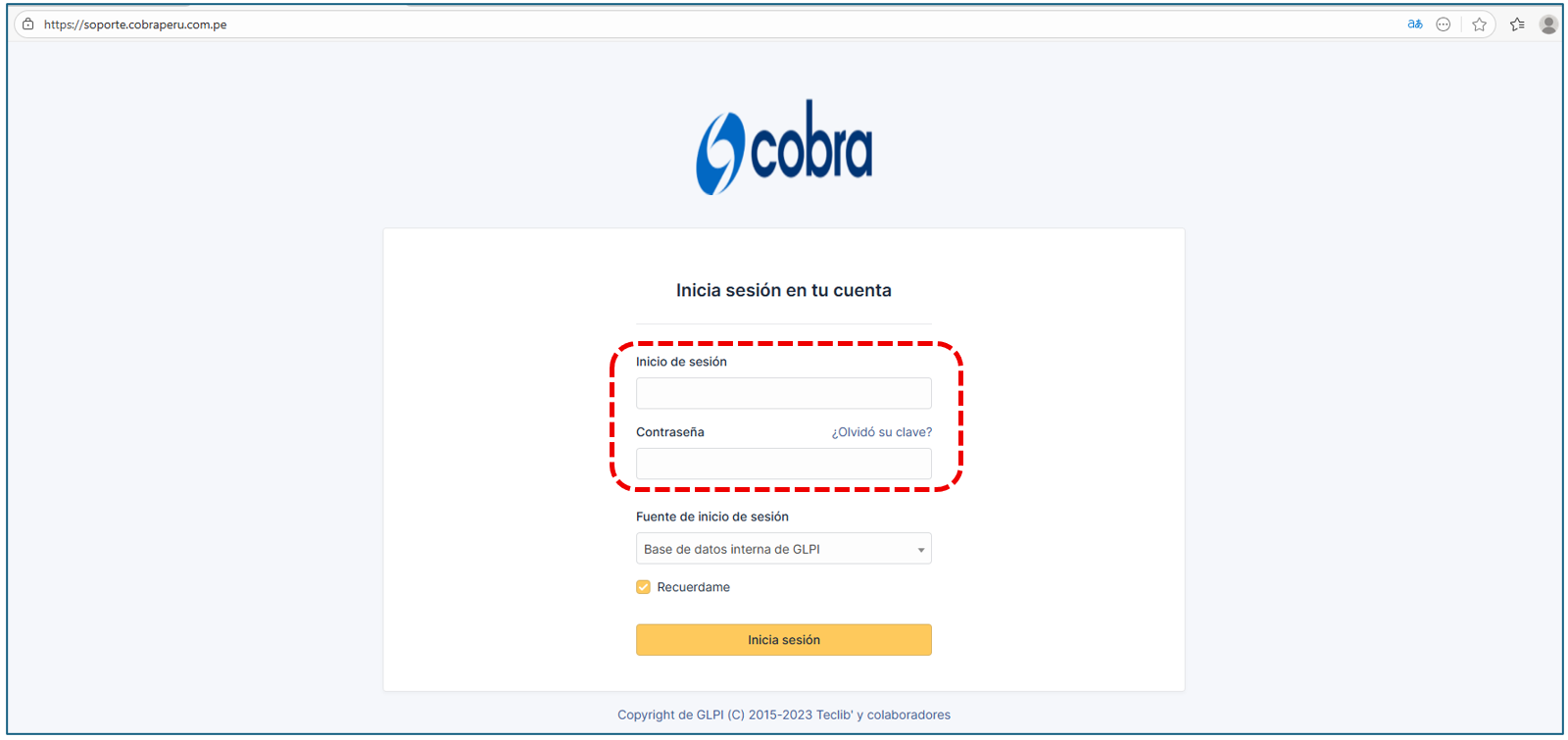 Al hacer clic, será redirigido a la plataforma: https://soporte.cobraperu.com.pe, donde podrá acceder con su usuario y contraseña al Centro de Soporte de Mesa de Ayuda.