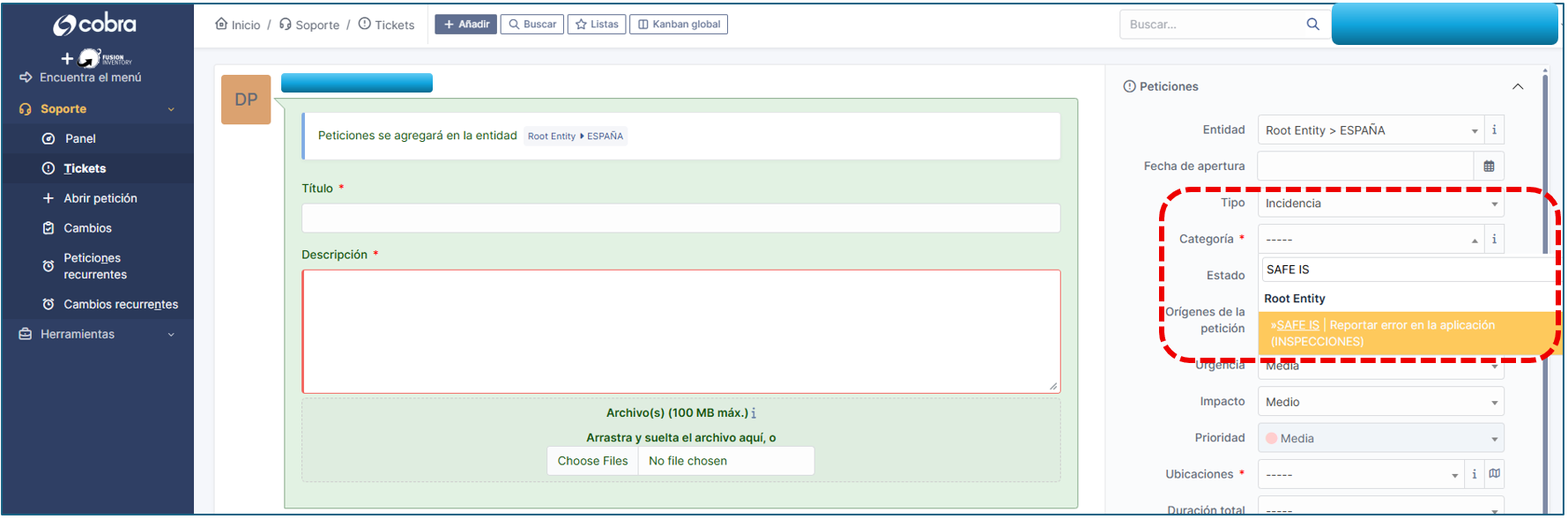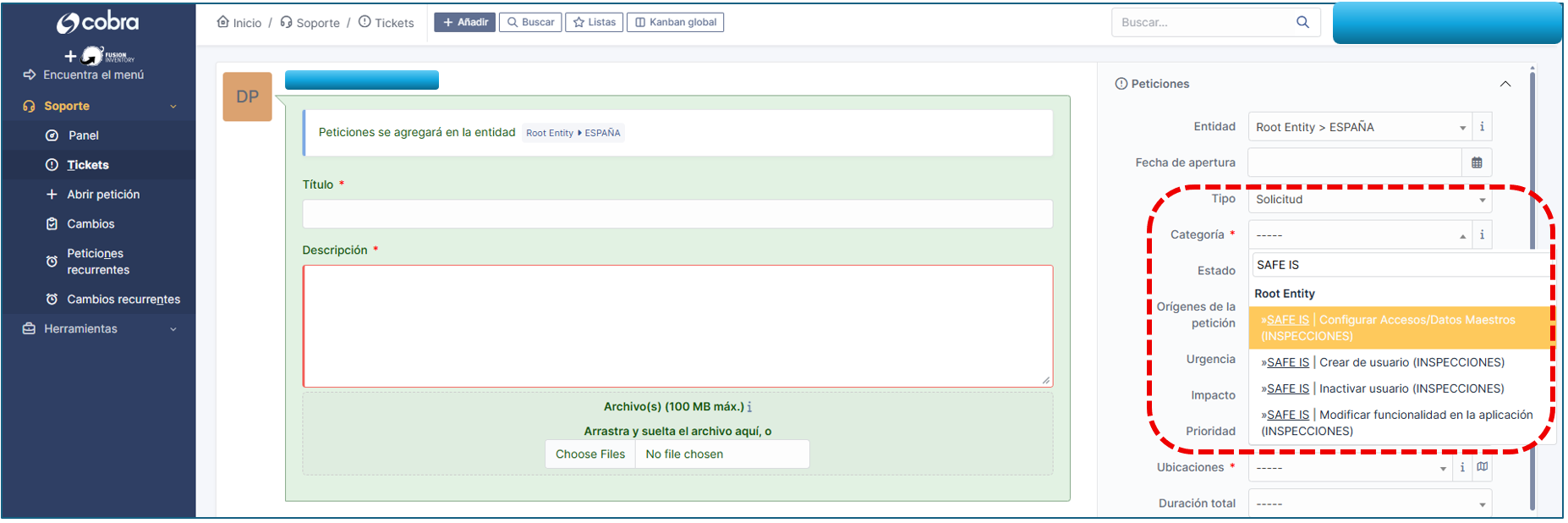 Una vez dentro, podrá generar un ticket de incidencia o solicitud.Entre las categorías disponibles, deberá seleccionar SAFE IS.