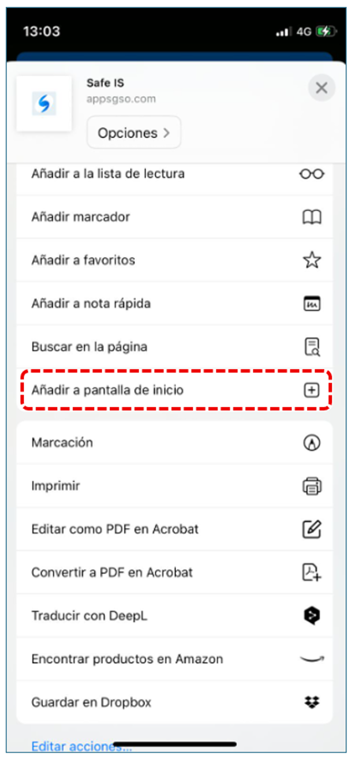 A new window will appear, where we will select the option “Add to Home Screen.”