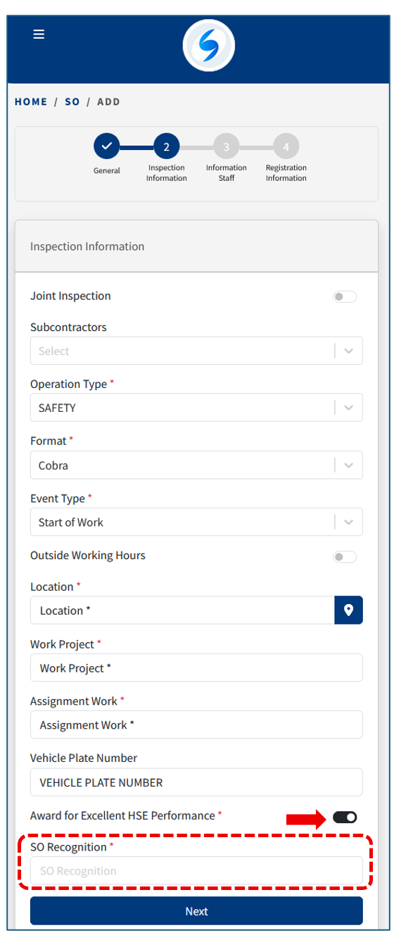 Unlike regular ones, in OPS inspections, on tab 2 when entering the information, the system allows adding a recognition for good performance: