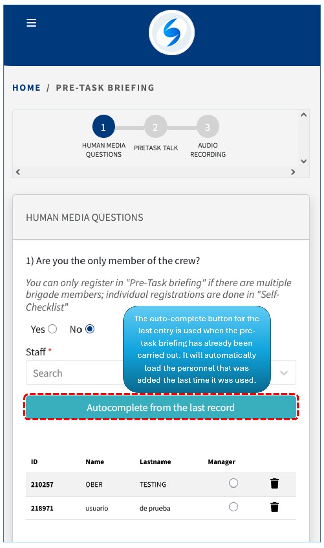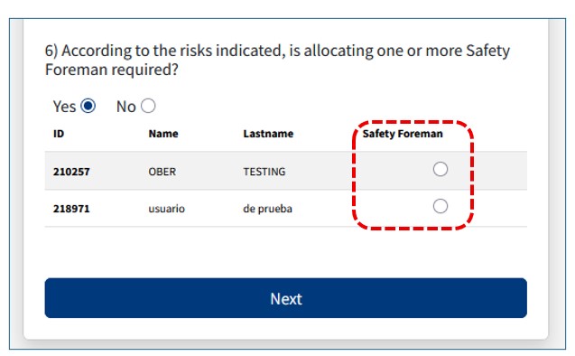 For Question 5, if you select YES, a list will appear with the names of the personnel entered in the first Human Resources section, and you must select one of them as the person to whom the preventive resources will be assigned: