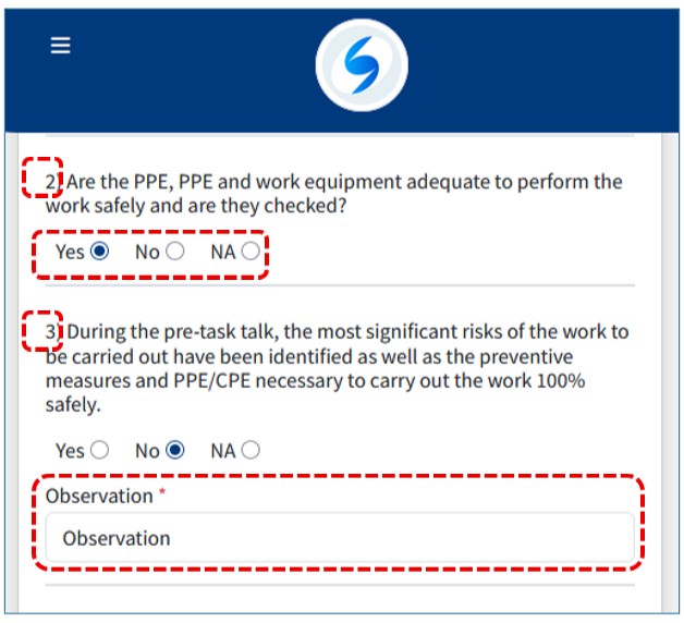 In the next section, we have the actual Pre-Task Talk questions. The first question concerns the Work Planning Meeting Record for the task to be performed — answer whether you have it. If you select NO or N/A, you must enter an observation about it: