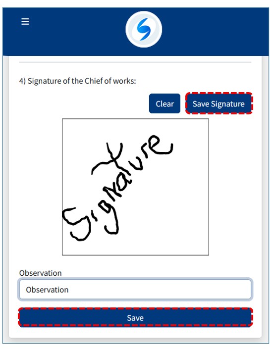 You must save the signature; if there is an error, you can clear it. Finally, if needed, enter an observation and click the SAVE button to record the entire Pre-Task Talk process.