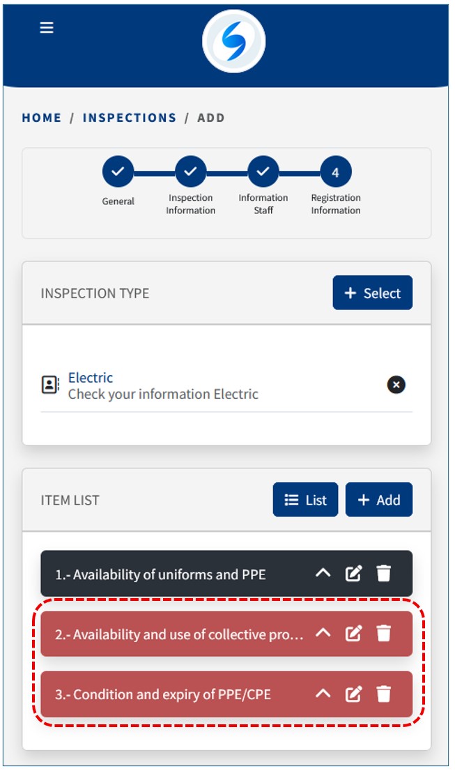 If one or more Types of Inspection are selected, proceed to select the reviewed Items. Select the list option to add the types of Items: