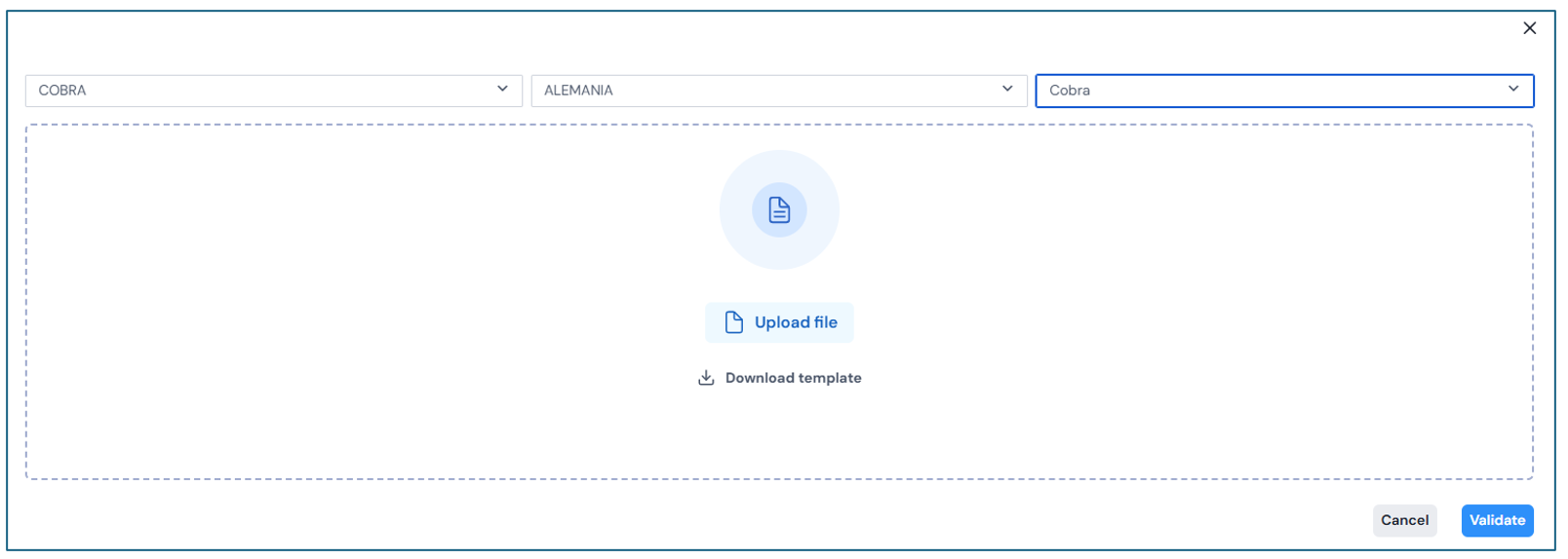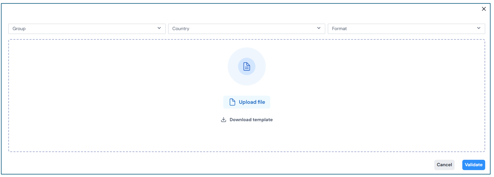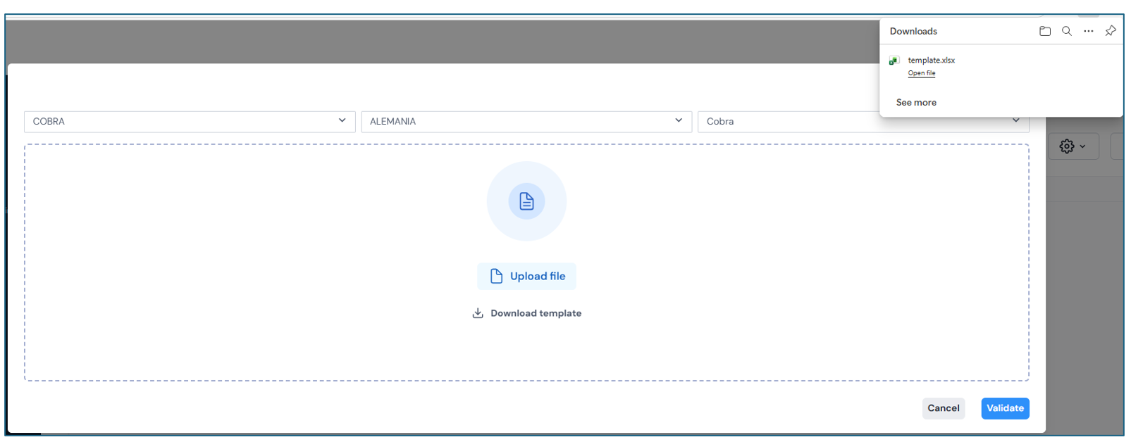 Enter the data into the downloaded template, then upload the file to proceed with validation.