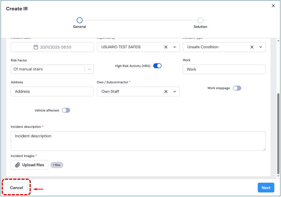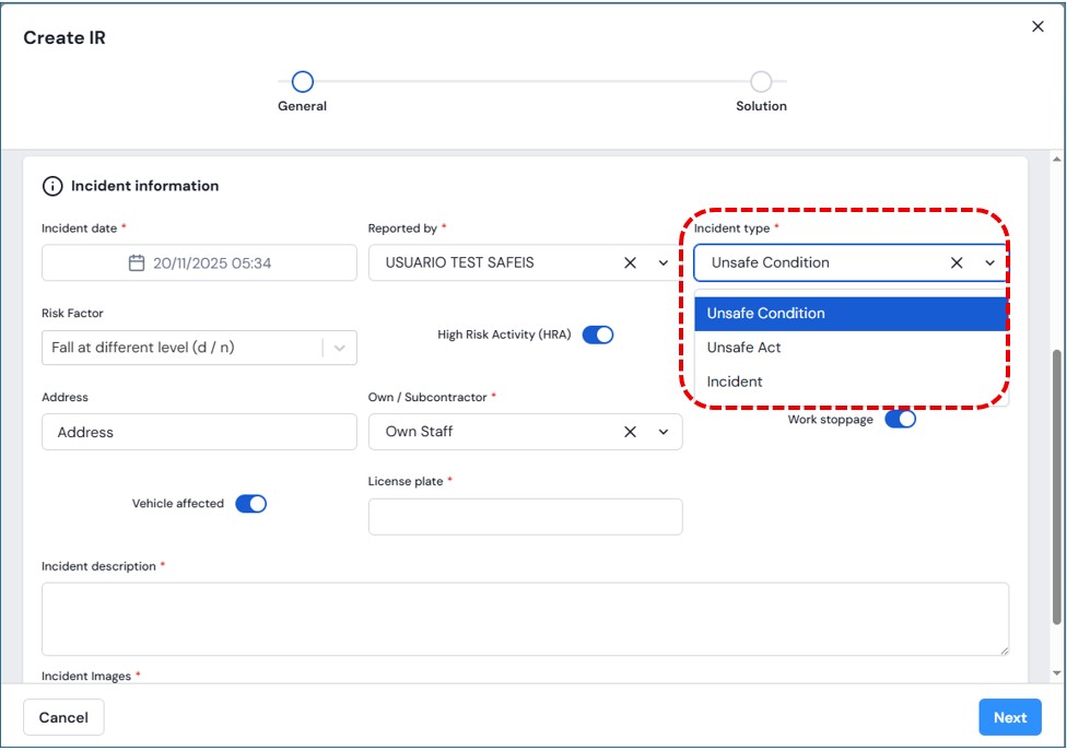 - Type of incident: Unsafe Condition, Unsafe Act, Incident