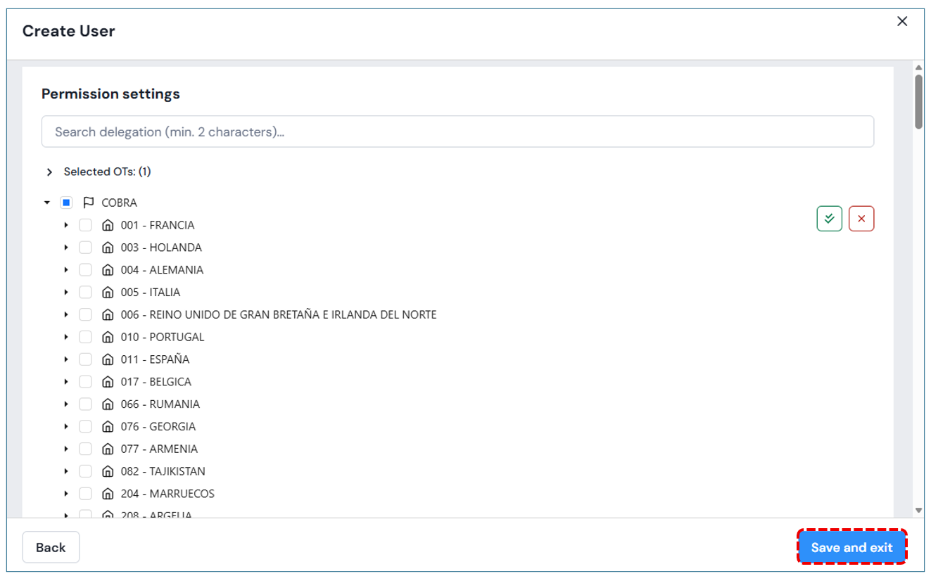Clicking the “Step 2 of 3”button requires entering the permissions Group, Country and Delegation.