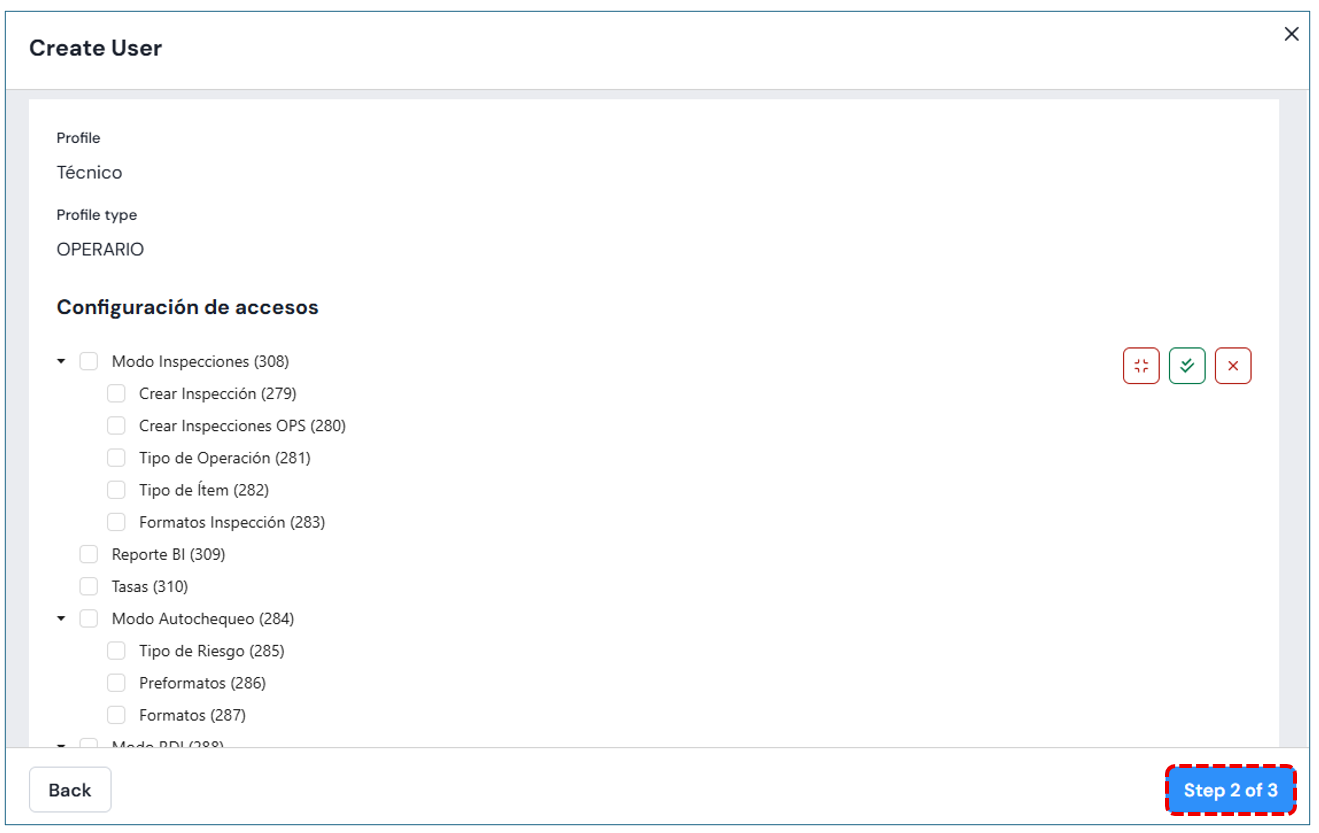 Next, the Profile Type will be displayed, and by default, a list of associated accesses will appear. You can validate these accesses or uncheck those you want to remove.