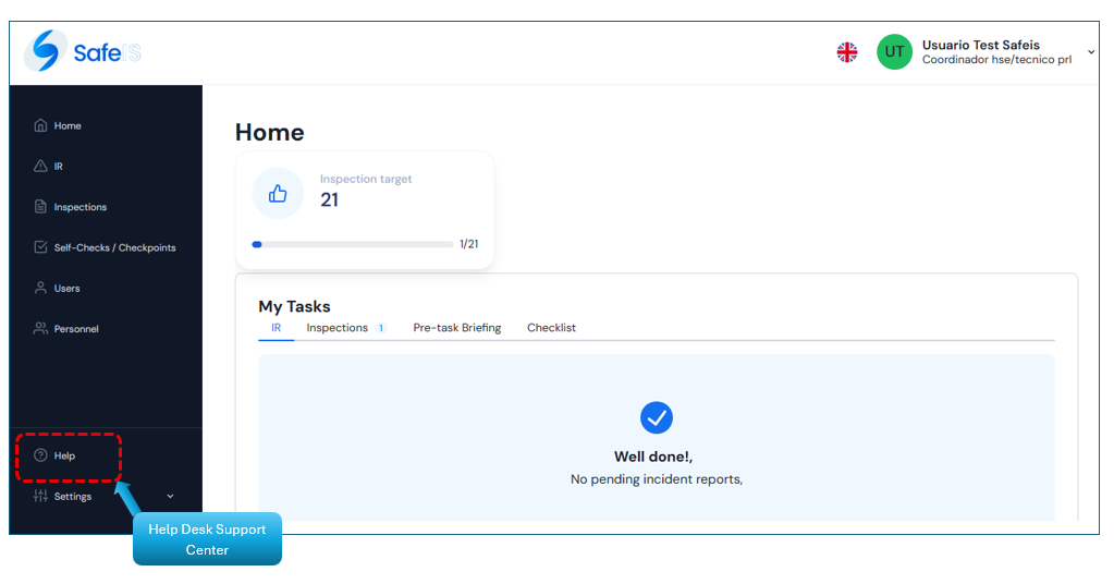 • User Information Panel: In the upper right corner, the user’s name and assigned profile are displayed, where the option to log out is also available.