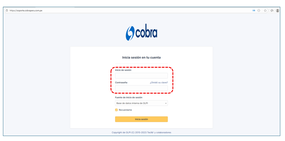 By clicking, you will be directed to the platform: https://soporte.cobraperu.com.pe, where you can log in with your username and password to the Help Desk Support Center.