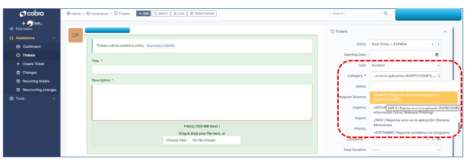 Once inside, you will be able to create an incident or service request ticket. Among the available categories, you must select SAFE IS.