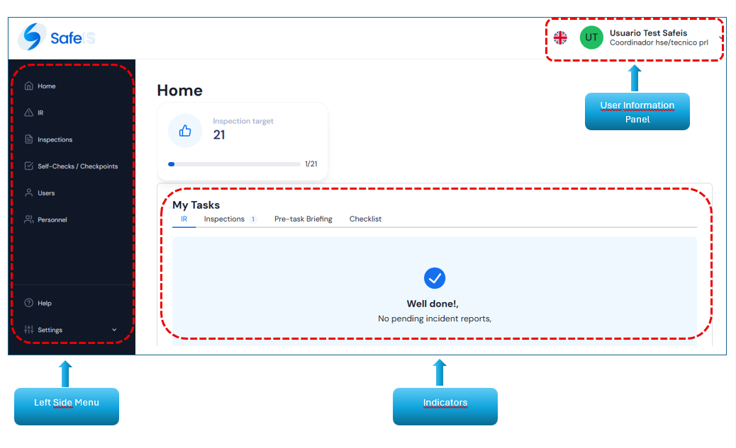 • User Information Panel: In the upper right corner, the user’s name and assigned profile are displayed, where the option to log out is also available.