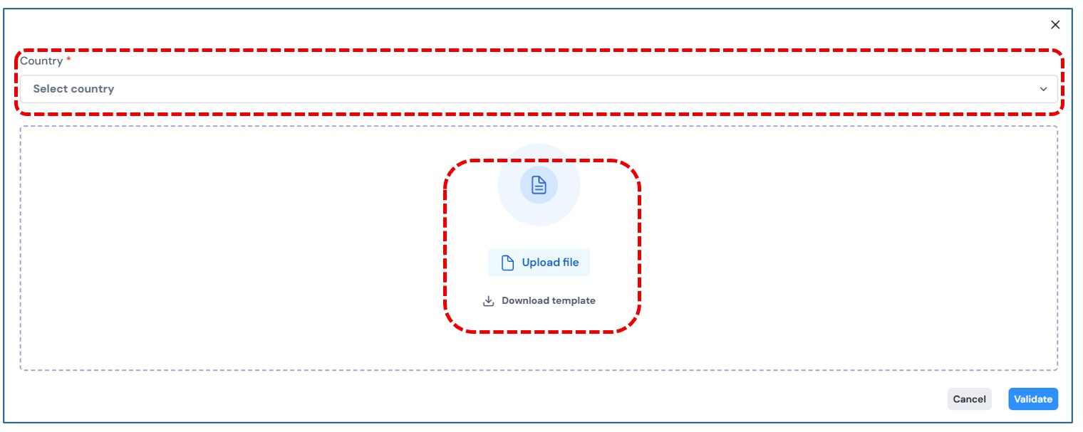 By entering the Group, Country and Format and Format fields, the corresponding template can be downloaded. Once the template has been filled out, upload the file to validate and save the information.