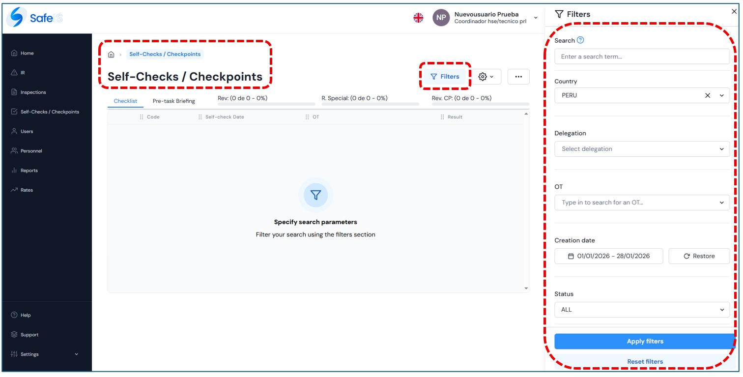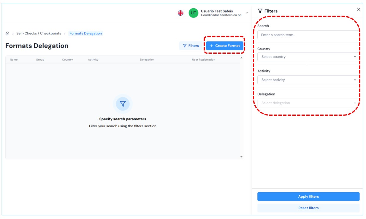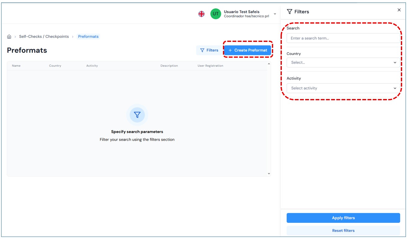 Upon entering, the main page will be displayed with the filter open to perform searches, using by default the country and user profile filters.