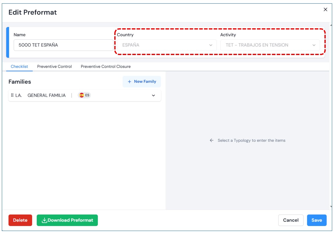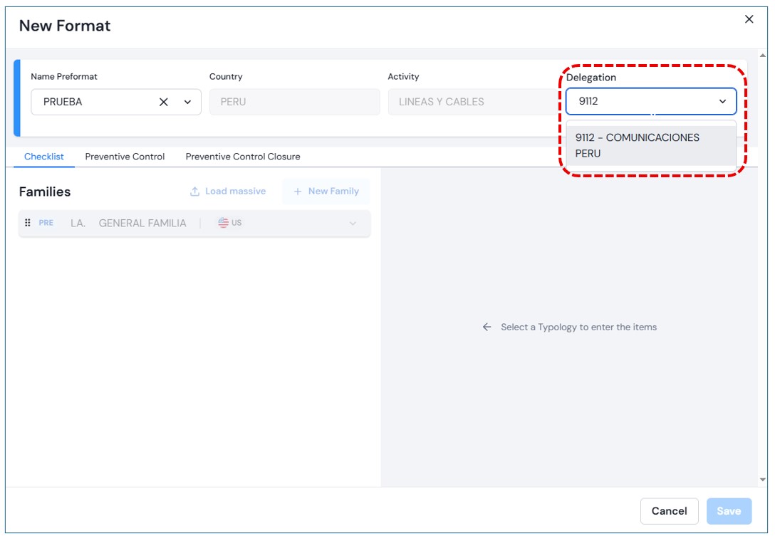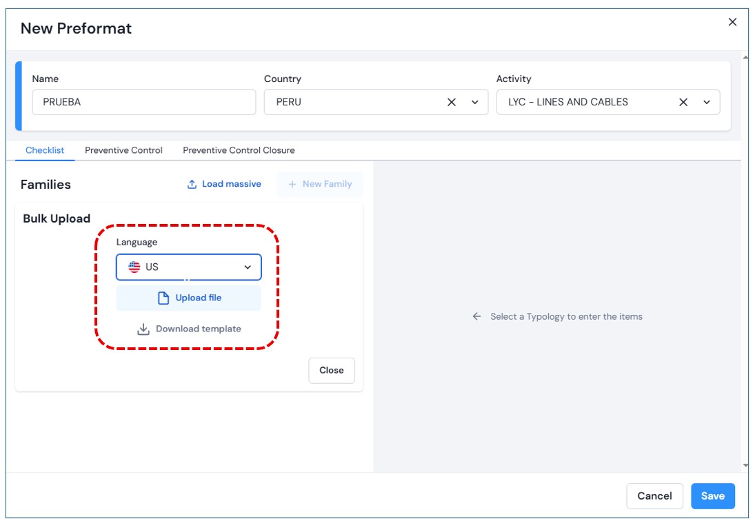 Once the fields are completed, the options in the tabs Auto-checklist, Preventive Control and , and Preventive Control Closure.In this section, you will see the families associated with the selected activity. You may also upload them in bulk via an Excel file or add them individually.