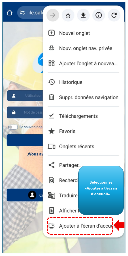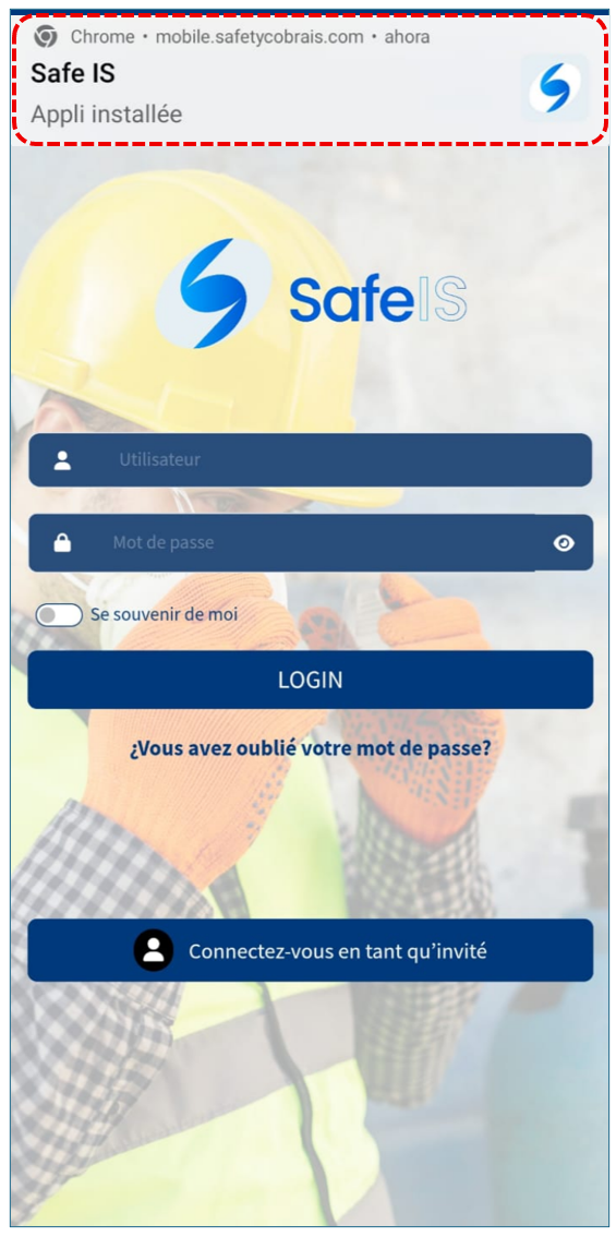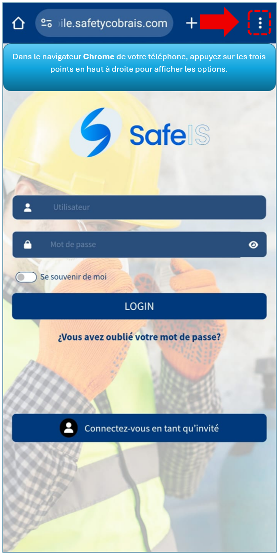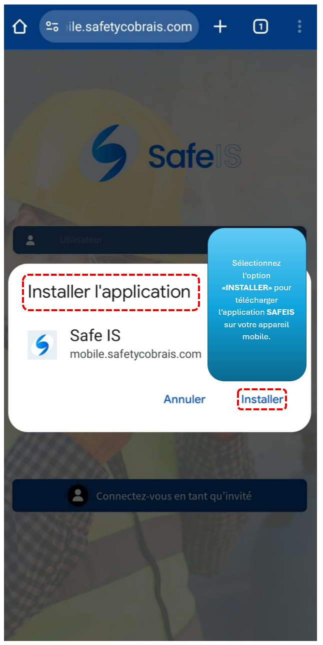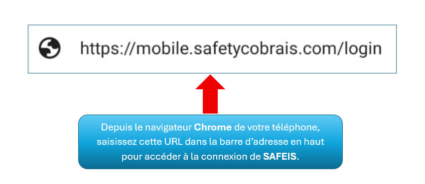 Pour installer l’application SAFEIS sur votre appareil mobile, vous devez saisir l’adresse suivante dans la barre d’adresse du navigateur Chrome :