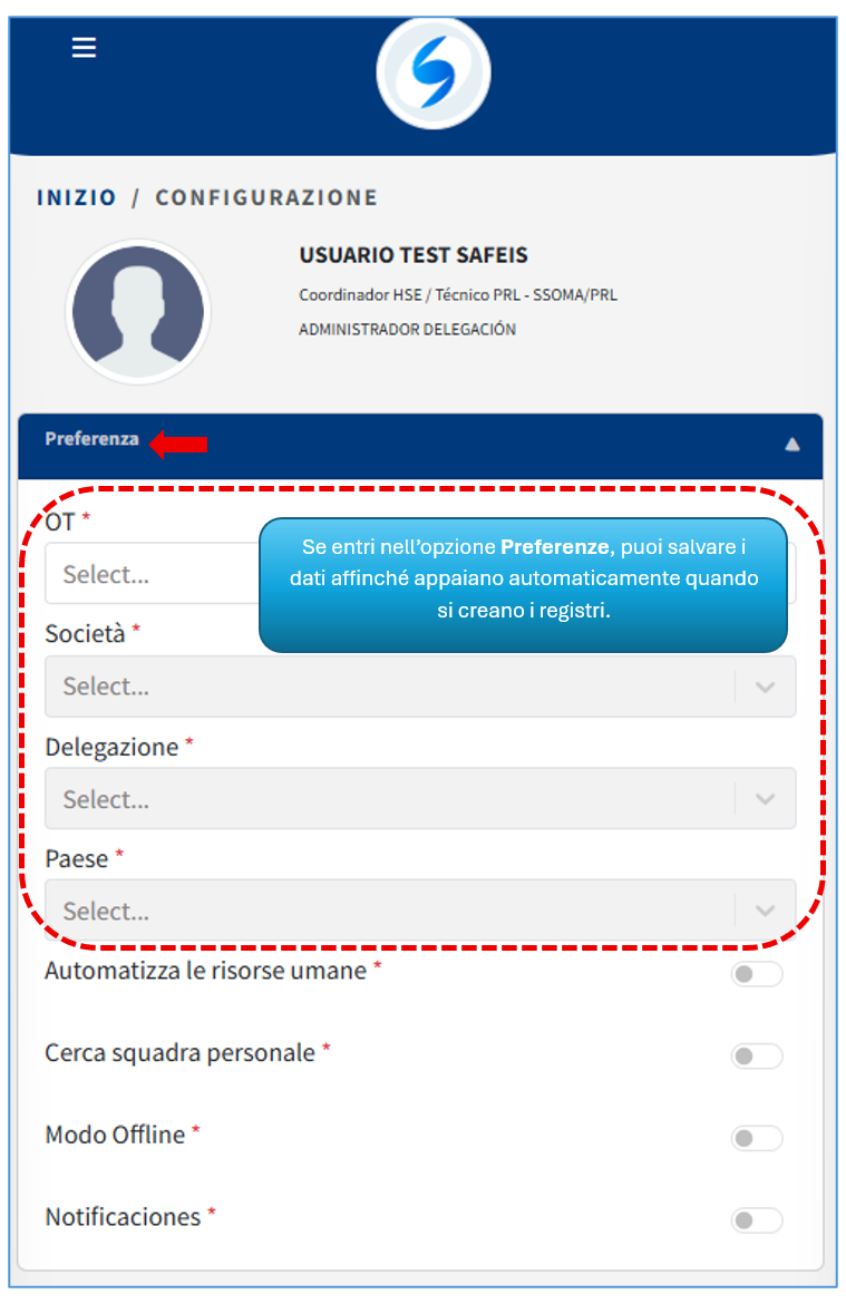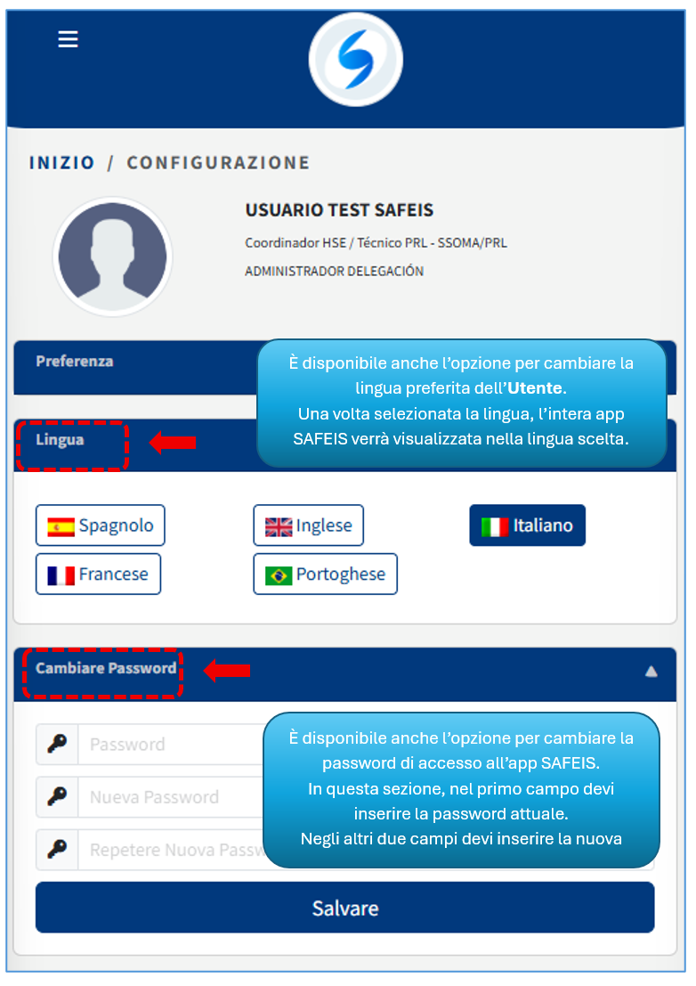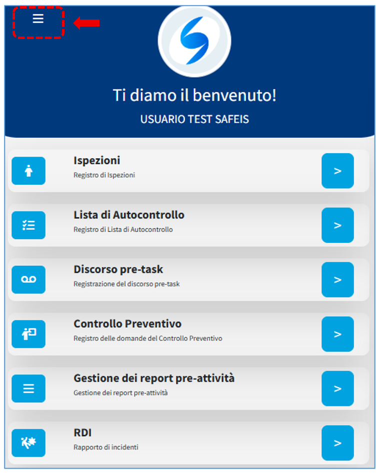Una volta entrato nell’app SAFEIS, vedrai tre linee orizzontali nell’angolo in alto a sinistra. Da questo menu puoi configurare diverse opzioni relative al tuo profilo utente.