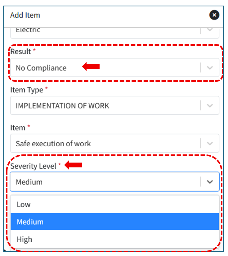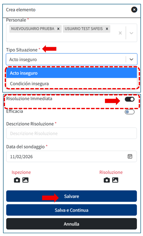 Se il risultato è Non conformità, devi indicare se il Tipo di situazione è un Atto non sicuro o una Condizione non sicura.